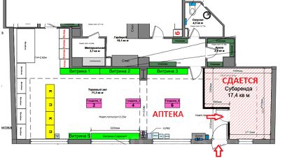 Сдается помещение площадью 17,4 кв.м. в аптеке Здравсити (смотрите план и фото). Стены построим после нахождения арендатора. В арендную плату все включено. Рассмотрим все предложения. Звонки принимаются в рабочие дни с пн-пт с 9.15 до 18.00.