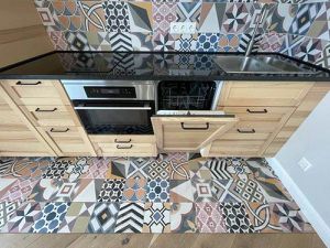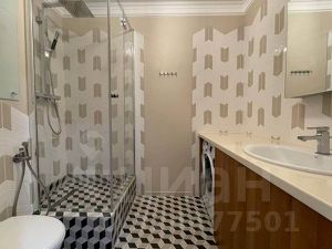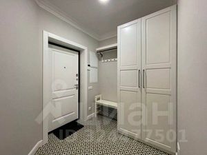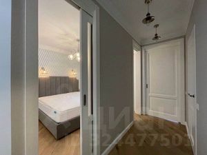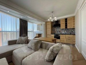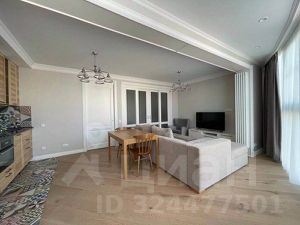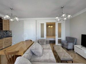 Квартира с дизайнерским ремонтом и мебелью в скандинавском стиле. Кухня-гостиная с большими панорамными окнами, спальня, гардеробная. Встроенный гарнитур с холодильником, посудомоечная и стиральная машины, кровать двуспальная, угловой двуспальный диван, кресло, пуф, шкафы, телевизор, стол, стулья, модем, полы с подогревом.