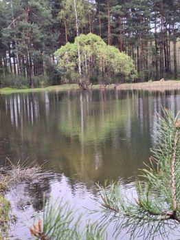 Сзади дома за калиткой лес и живописный пруд .