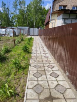 Двор прямоугольный,спереди и по периметру выложен плиткой красивой,установлены ворота с калиткой.