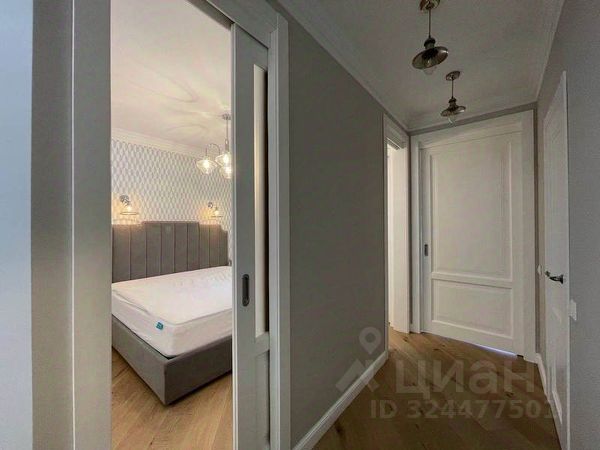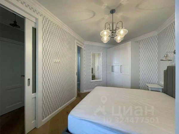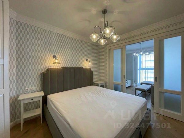Квартира с дизайнерским ремонтом и мебелью в скандинавском стиле. Кухня-гостиная с большими панорамными окнами, спальня, гардеробная. Встроенный гарнитур с холодильником, посудомоечная и стиральная машины, кровать двуспальная, угловой двуспальный диван, кресло, пуф, шкафы, телевизор, стол, стулья, полы с подогревом.